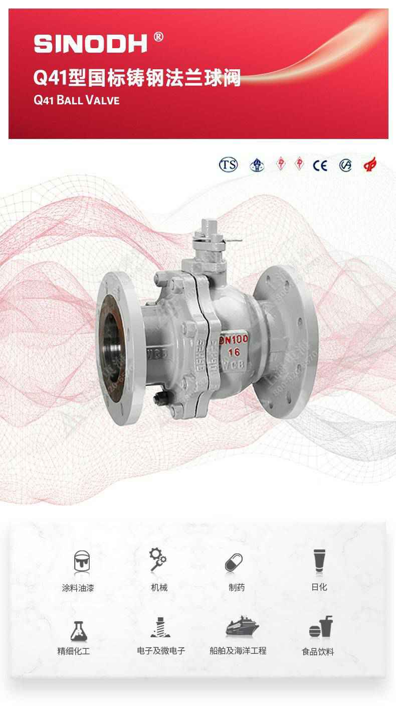 Q41型国标铸钢法兰球阀,为开云官方版网站登录入口-开云(中国)自主研发生产。本产品设计制造标准符合GB/T12237、GB/T12224标准。该产品的球体在介质压力作用下球体能产生一定的位移并紧压在出口端的密封面上,保证出口端密封。适用于水、溶剂、酸和天然气等一般工业介质也适用于工况恶劣的介质,如氧气、过氧化氢、甲烷和乙烯等介质。